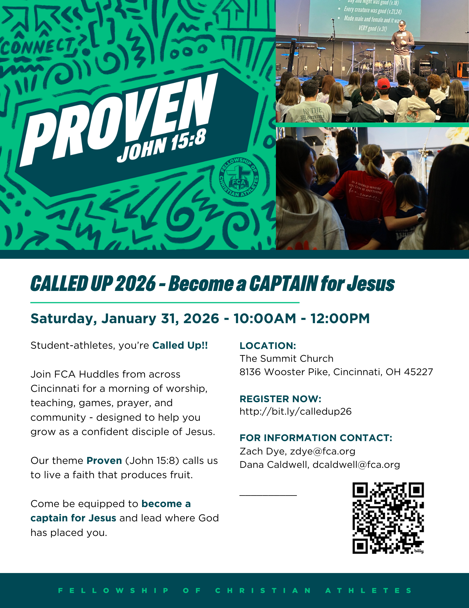Join student-athletes from across Cincinnati for a high-energy FCA experience with worship, teaching, games, and real conversations about faith. Come grow stronger in Christ, connect with other athletes, and