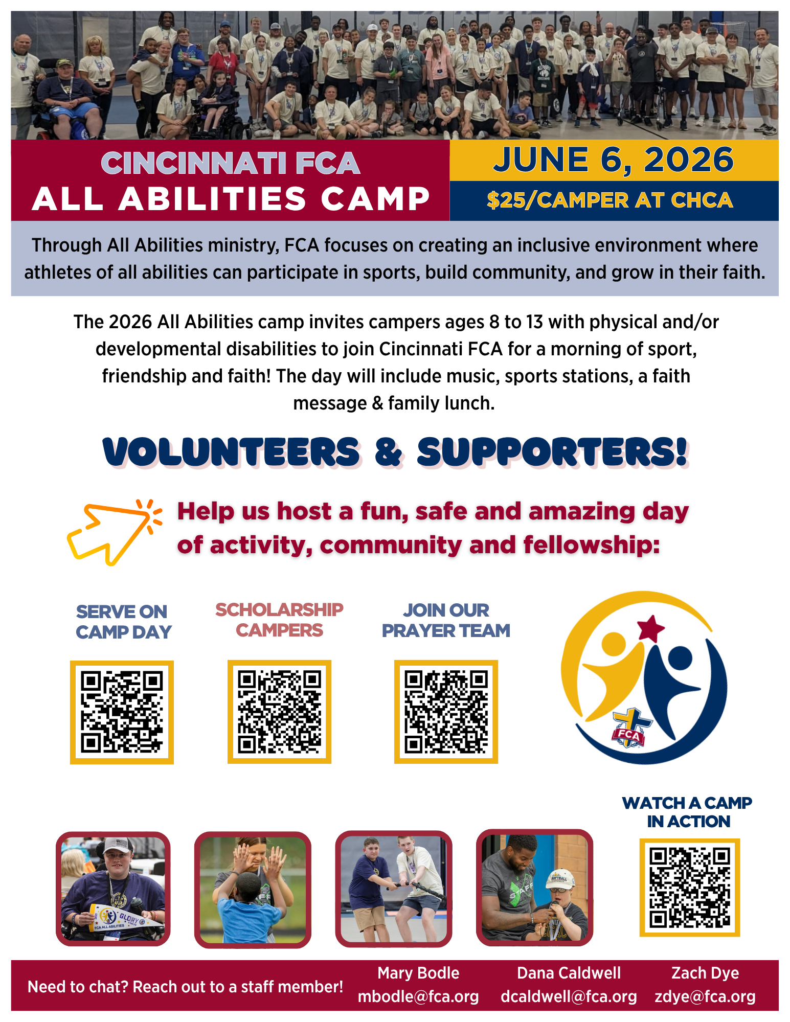 The FCA All Abilities Camp includes all the perspiration and inspiration that comes with an FCA camp, with an added focus on providing a fun, safe, quality camp environment for individuals with disabilities. This sports day camp will include activities such as soccer, football, baseball/softball, physical fitness, and more! Camp will also feature a spiritual message that will be taught and applied at camp.